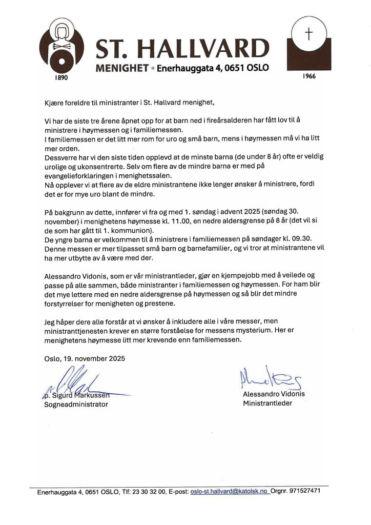 Jeg er fortsatt generalvikar i bispedømmet, men vil etter beste evne feire messer, dåp og andre sakramenter i St. Hallvard. Planen er også at jeg skal ha kontordag her i menigheten stort sett hver onsdag.